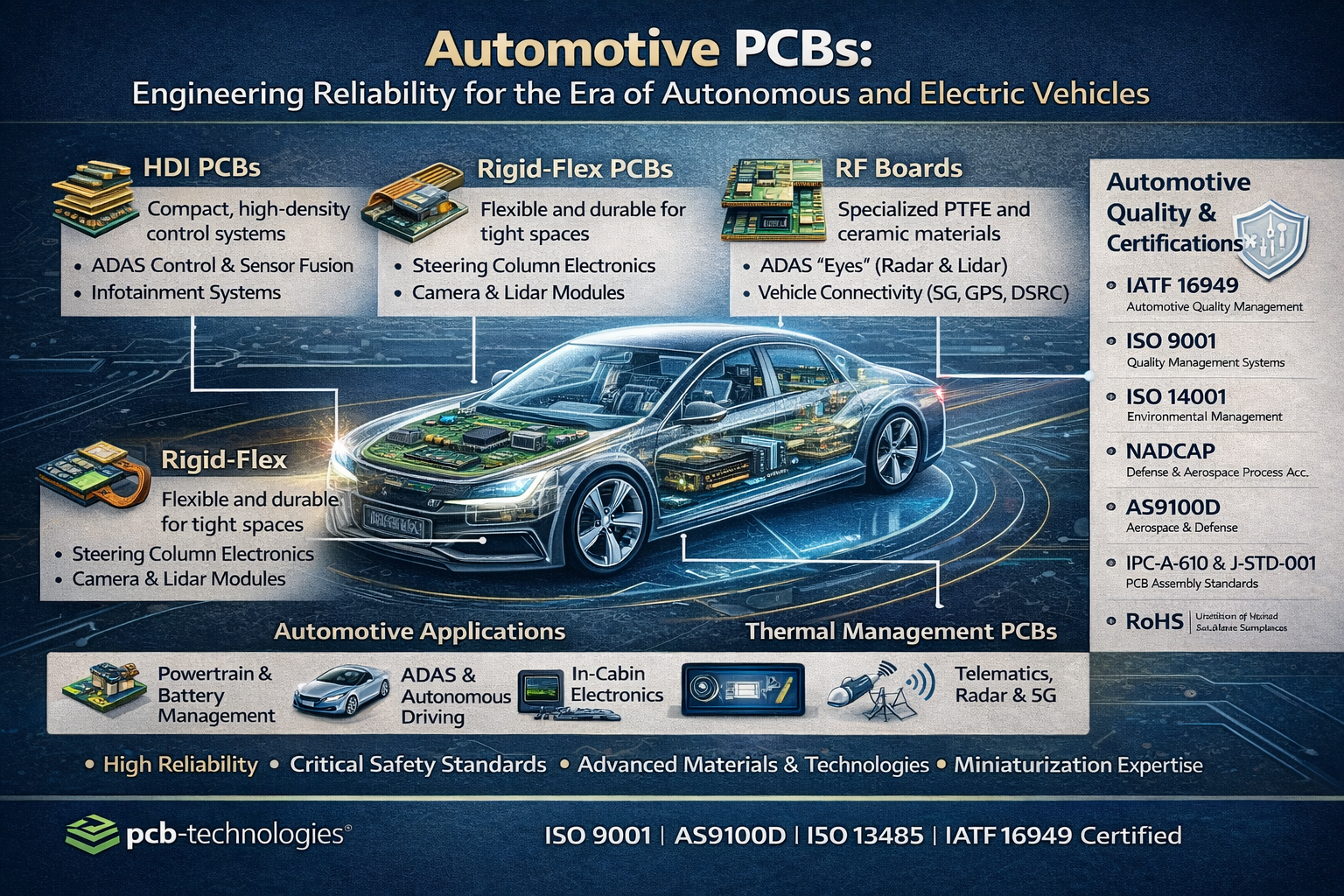 Automotive PCBs are among the most demanding products in the electronics manufacturing industry. Failure is not an option: a board that malfunctions in an automotive safety system can have life-altering consequences. This article explores the technology, standards, and applications that define automotive PCBs — and explains why pcb-technologies is a trusted supplier to OEMs and their Electronic Manufacturing Services (EMS) providers worldwide.